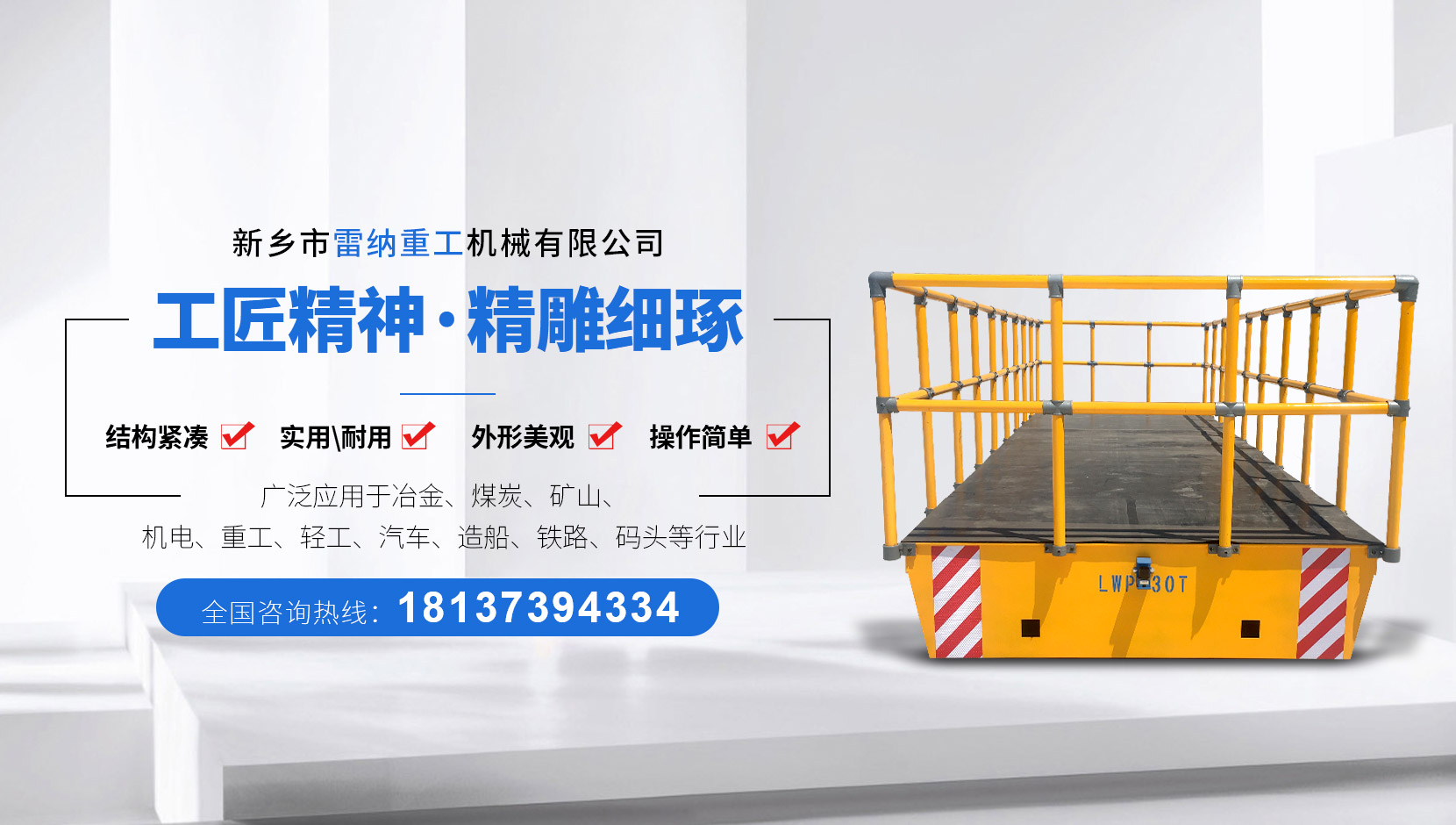 新鄉市雷納重工機械有限公司電動平車事業部是一家轉彎電動平車、無軌電動平車、電動軌道車、軌道平車和物料搬運設備的生產廠家,致力于工廠、車間、倉儲、碼頭、鐵路等領域物料搬運系統的開發、設計、生產、銷售和服務。公司擁有現代化的管理團隊、具有多年電動平車研發設計實踐經驗的技術開發團隊和多名工齡在20年以...